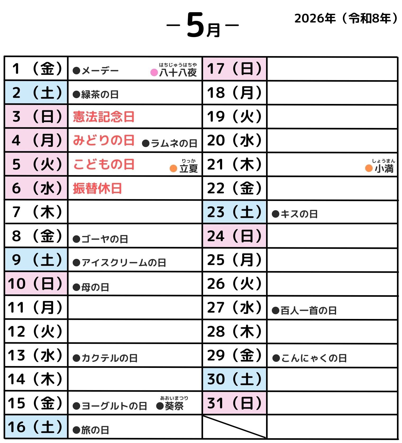 最後に付録として、2026年度5月の年中行事・祝日・二十四節気・記念日が分かるカレンダーを載せておきました。日々の生活にお役立てください。