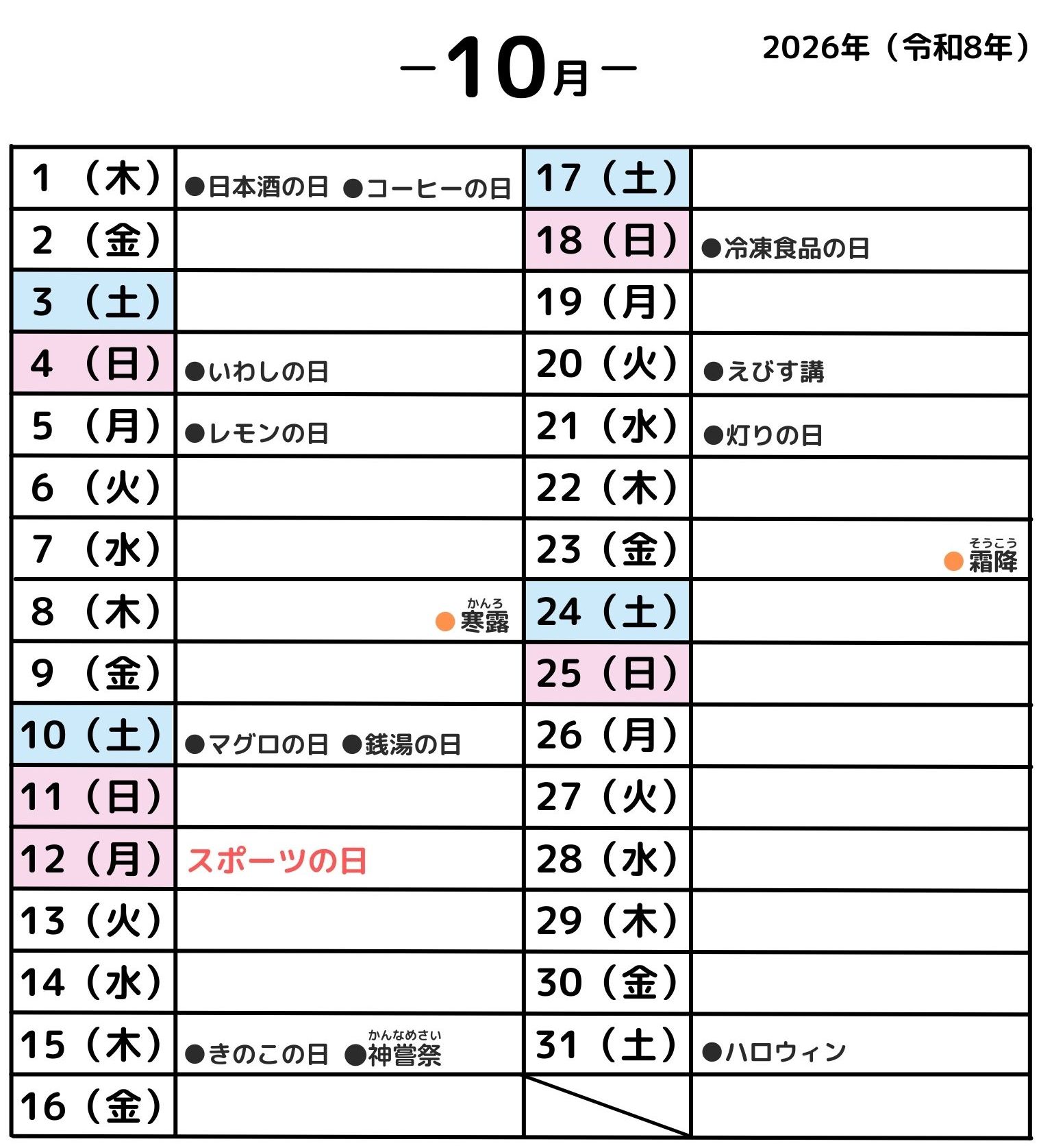 付録として2026年10月の行事・祝日・二十四節気・記念日が分かるカレンダーを載せておきました。日々の生活にお役立てください。