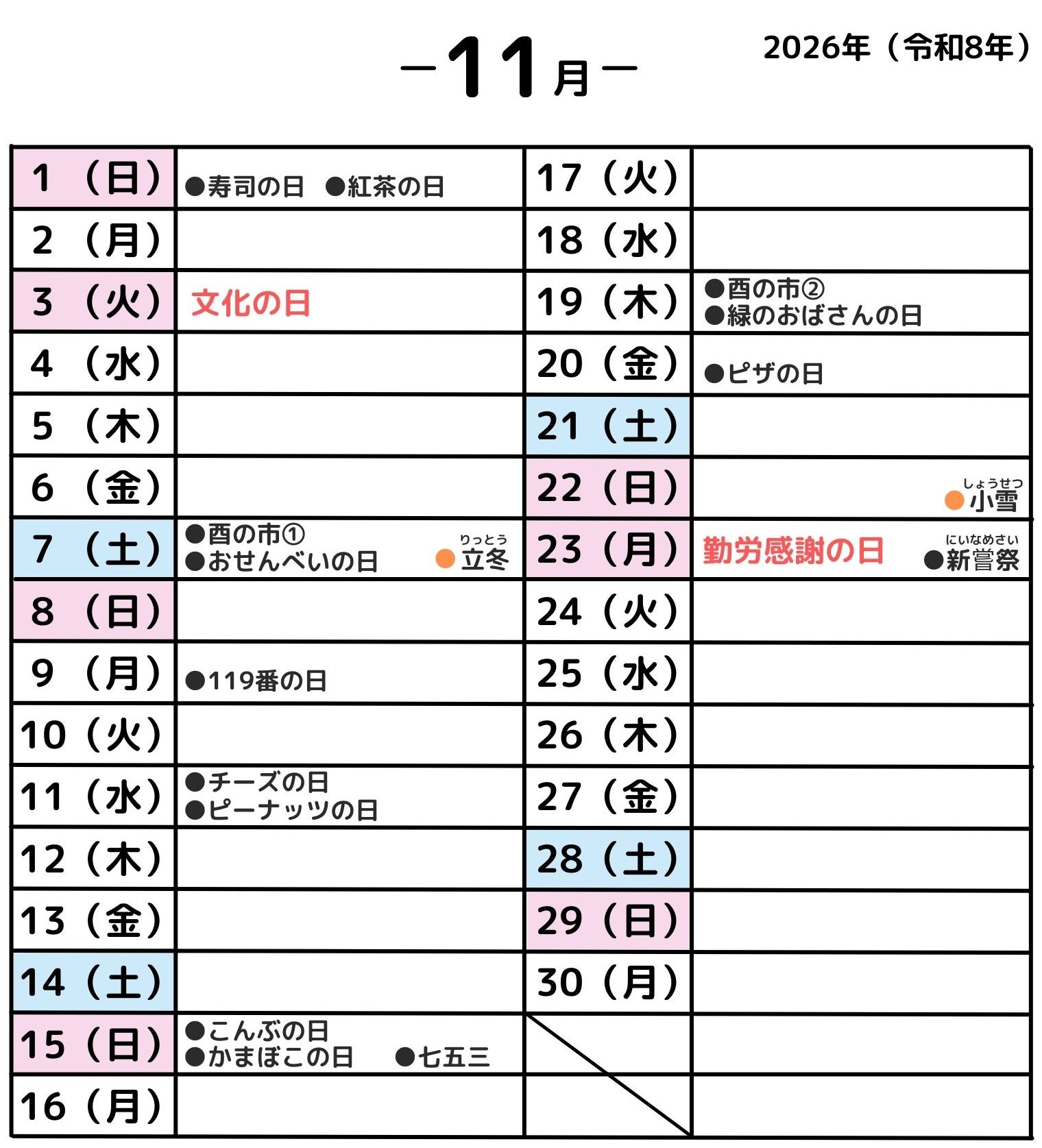 ■2026年11月のカレンダー【付録】