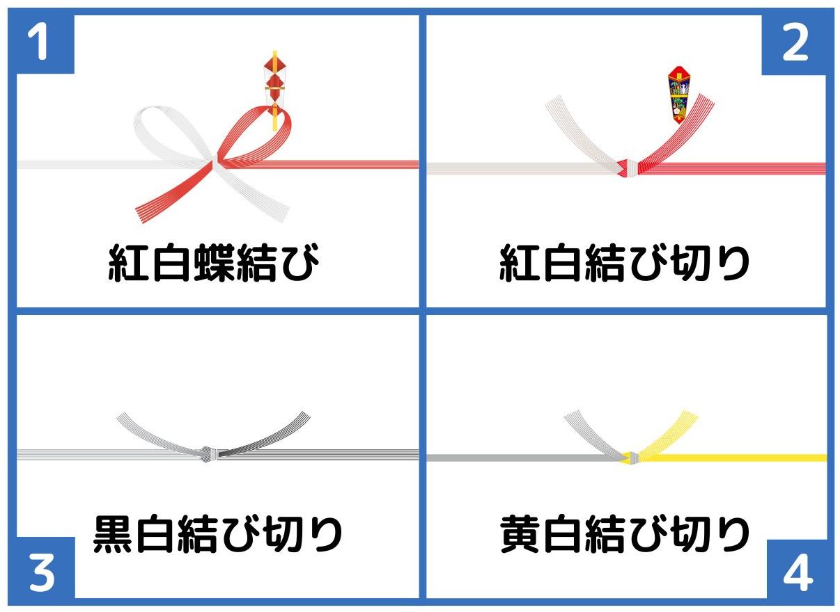 熨斗に用いる代表的な水引には「紅白蝶結び」「紅白結び切り」「黒白結び切り」「金白結び切り」の4種があります。