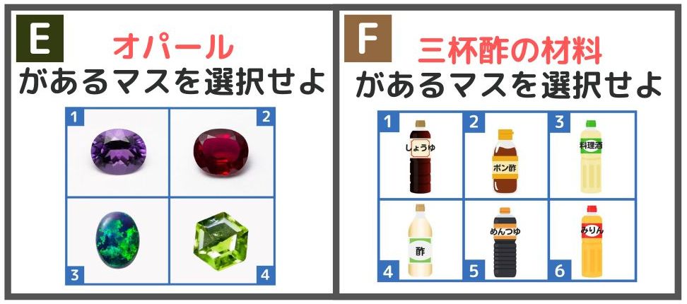 ●プレッシャークロック/タイマンプレッシャークロック・・落ち着いて考えれば10秒以内に答えられる問題を一人ずつ出題。制限時間は6人で60秒で、時間内に6人とも正解すればクリアとなる。(※タイマンプレッシャークロックでは、各チーム1対1で対決し、相手チームを先に全滅させたら勝利)